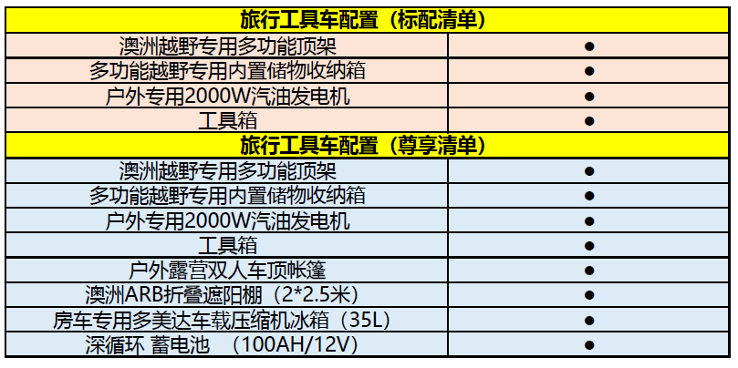 “独享侠旅行工具车”具备了野外旅行中的所有功能,真正将越野、探险、摄影、垂钓等生活方式一网打尽。目前“独享侠旅行工具车”有高配、标配两种选择,真正满足车友个性化的需求。